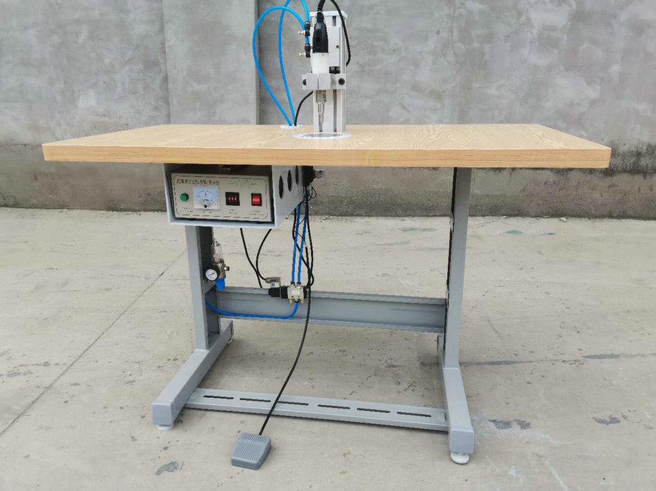 本機以超聲波將綁帶融合于口罩本體兩側,進而完成綁帶式口罩成品,只需一名操作員將口罩片置于超聲波發(fā)生器的頭上,后將綁帶放在口罩片上,腳踏踏板使氣缸向下運動,縫住綁帶和口罩片。